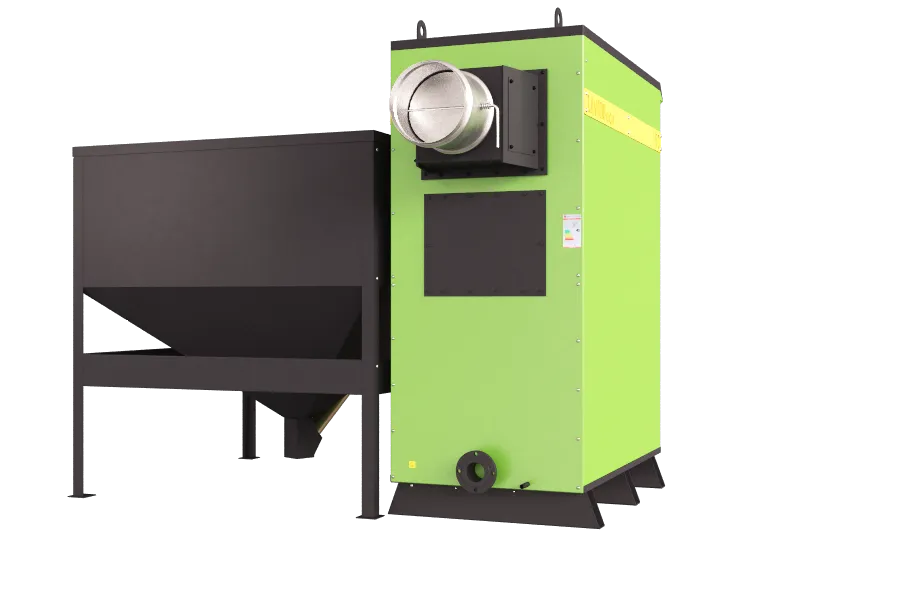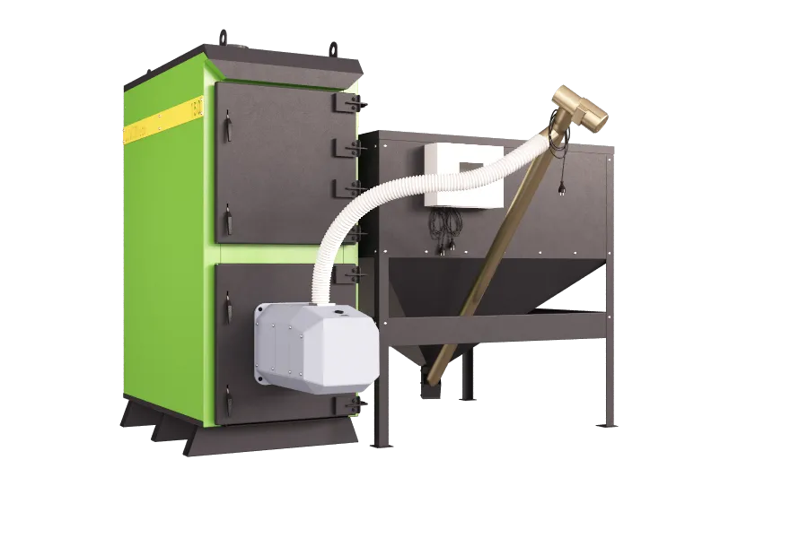 Котел может работать как на пеллетах так и на дровах, для этого требуется комплект колосников*, который устанавливается в топочную камеру. Также котлом можно управлять удаленно, используя интернет модуль, который позволяет контролировать все параметры котла через смартфон в любой точке мира где есть интернет, теперь нет необходимости вызывать специалиста для настройки котла домой, так как все можно настроить удаленно. Также котел данной серии может быть выполнен в компактном исполнении с бункером объемом 1000 л - это сделано для возможности установки пеллетного котла в ограниченном пространстве котельной.