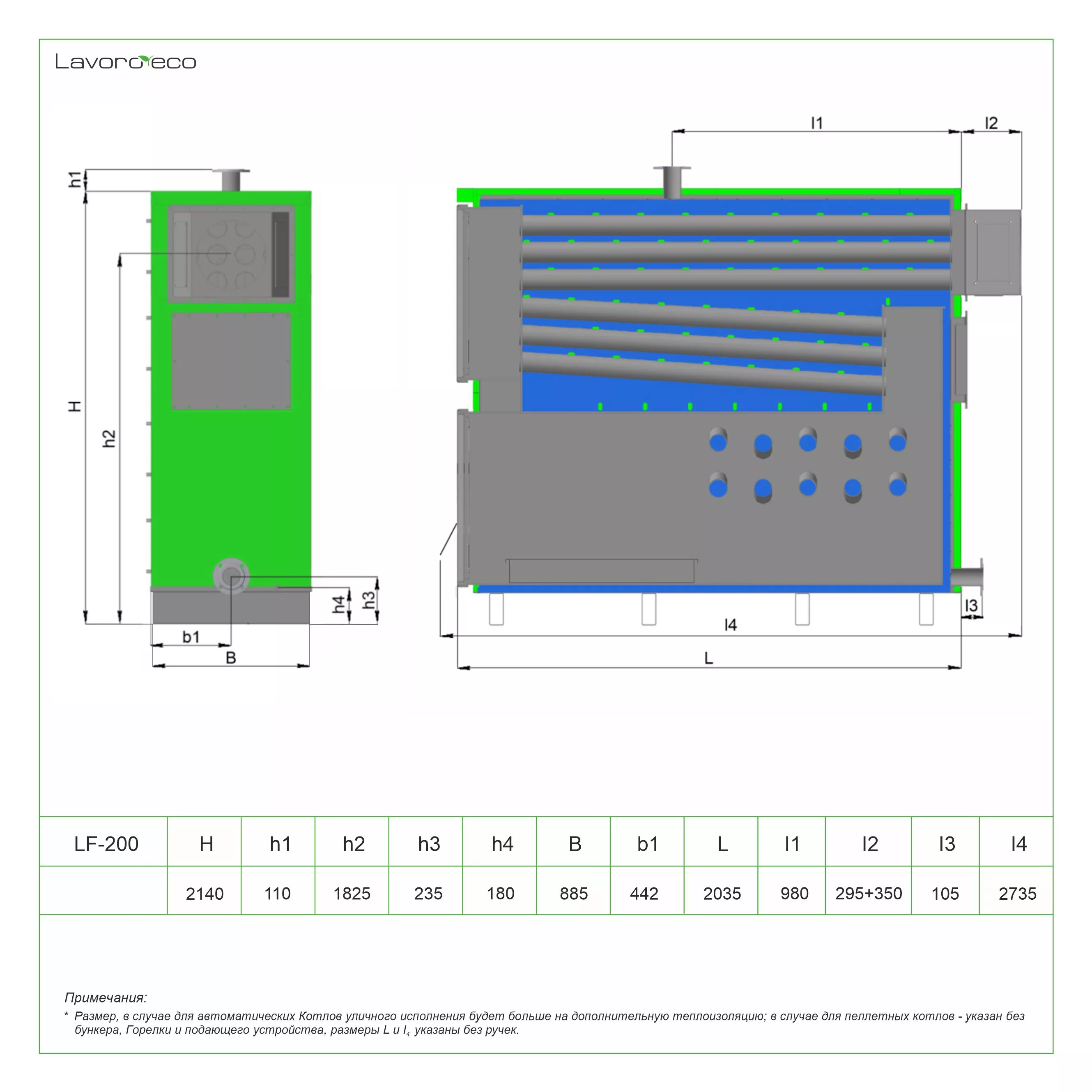 Пеллетный котел Lavoro ECO серии LF - это современный стальной водогрейный котел, работающий в полностью автоматическом режиме, предназначенный для отопления жилых и производственных помещений, а также для обеспечения горячей водой (ГВС). В котел встроена современная факельная горелка из специальной нержавеющей стали толщиной от 5 мм. В качестве топлива используются пеллеты (за исключением пеллет из отходов мебельного производства), котел оснащен бункером для их загрузки и шнеком для их подачи в горелку; как резервное топливо можно использовать дрова (требуется колосниковая решетка - доп.опция). Управление производится при помощи автоматики, также возможно дистанционное управление котлом (доп. опция). Горелка по умолчанию оснащена механизмами автоочистки и авторозжига.