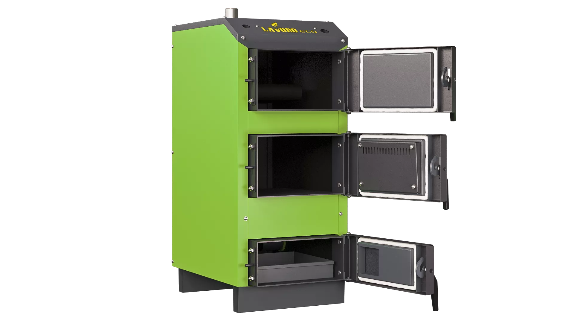 В пиролизном котле «Lavoro eco» не происходит прямого сгорания топлива, поэтому топка имеет небольшие размеры, что в итоге сказывается на размерах самого котла - они значительно меньше обычных твердотопливных.